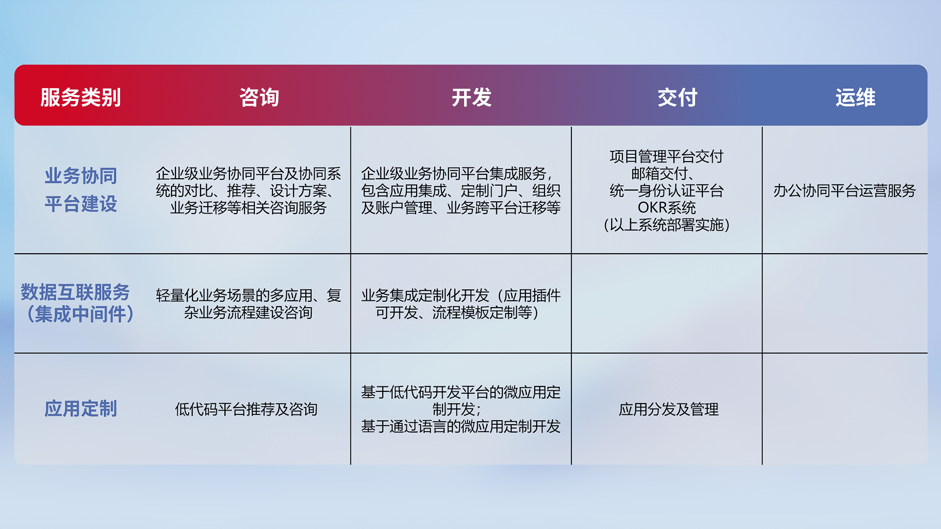 针对钉钉、、企微、、、、IDaas等平台级产品提供产品的规划、、、方案、、交付、、、定制化开发等服务,,实现如统一协同办公、、、智能客户服务、、、、混合会议管理、、、、智能数据查询、、、等业务场景,,实现数字化转型。。。。